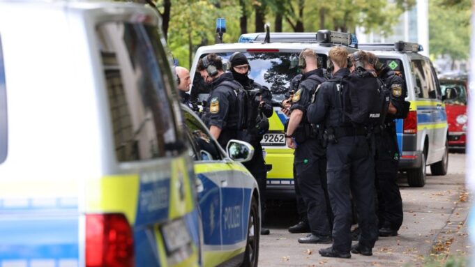 A polícia alemã é vista no Theresienwiese Grounds do Oktoberfest Beer Festival em 1º de outubro de 2025 em Munique. (Foto AFP)