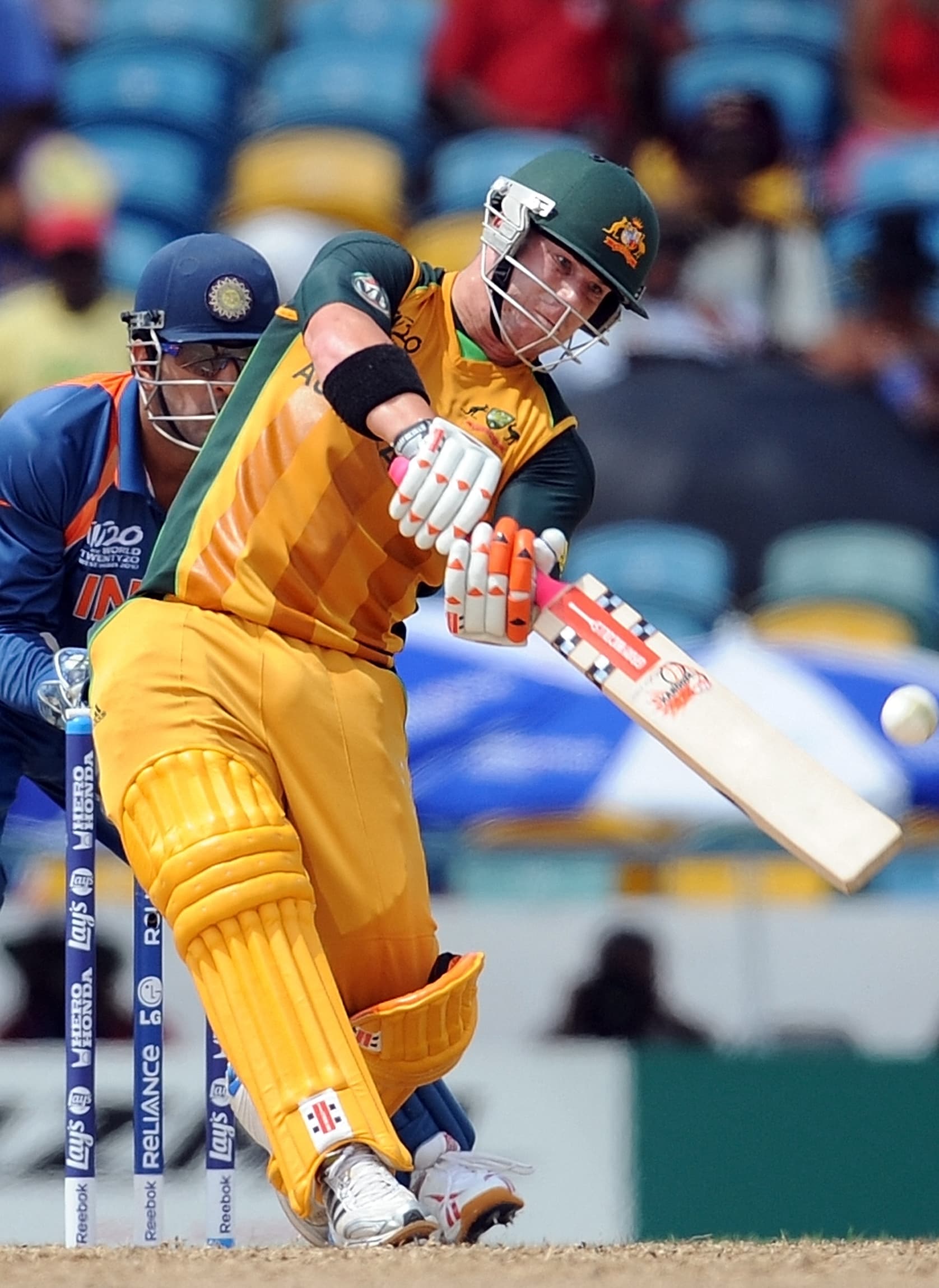 David Warner, da Austrália, marcou 72 corridas em 42 bolas contra a Índia na partida da Copa do Mundo T20 de 2010, disputada em Bridgetown, em 7 de maio de 2010. (Crédito da imagem: AFP)