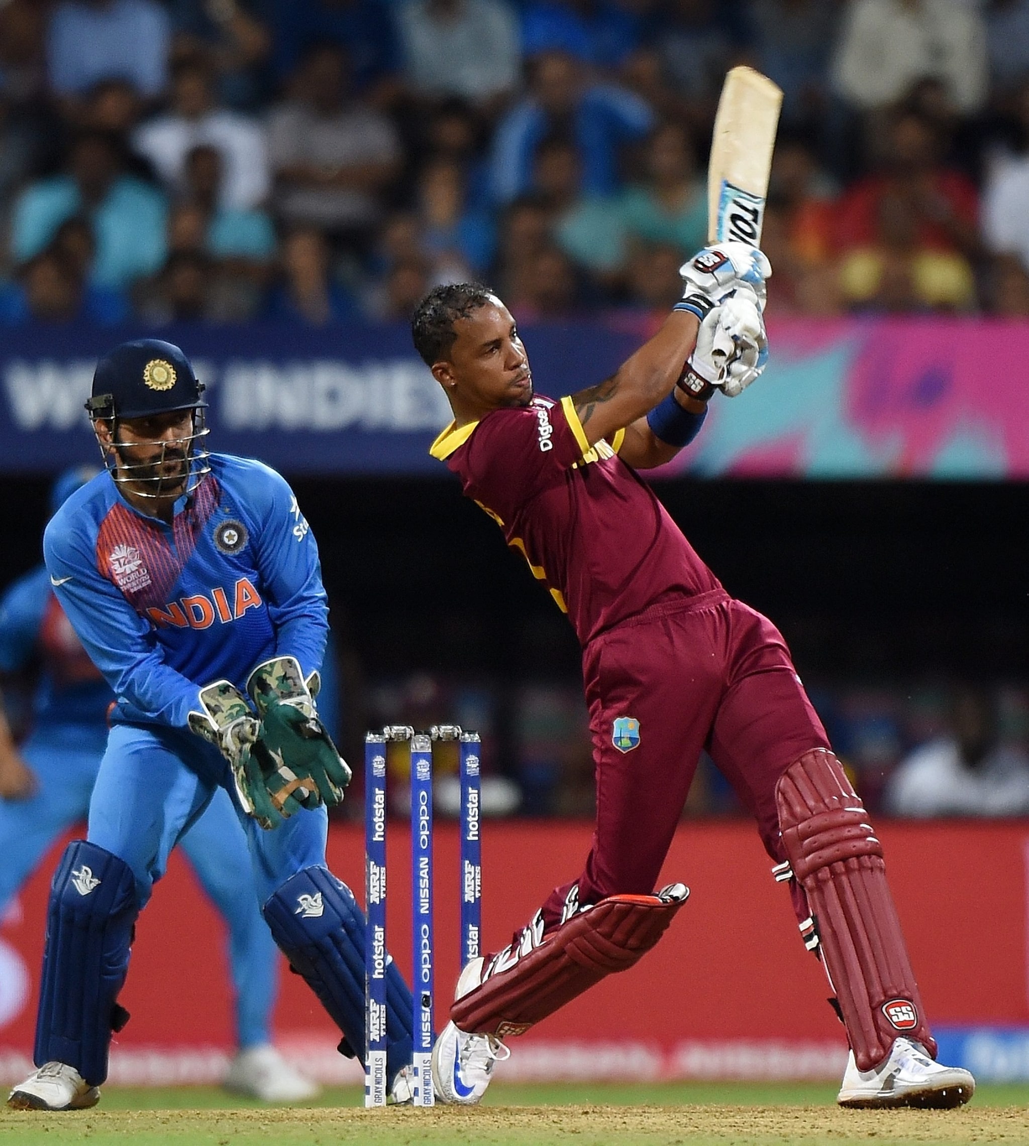 Na segunda semifinal da Copa do Mundo T20 de 2016, disputada no Estádio Wankhede, em Mumbai, em 31 de março, Lendl Simmons, das Índias Ocidentais, marcou 82 corridas em 51 bolas. (Crédito da imagem: AFP)