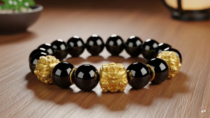 Essas pulseiras são normalmente feitas dos seguintes elementos: Pixiu – um símbolo de riqueza e prosperidade, obsidiana negra – proteção contra energia negativa, olho de tigre, citrina, jade verde etc. – para benefícios específicos, moedas chinesas, atrações sortudas, etc. – para boa sorte. (Imagem gerada pela IA)