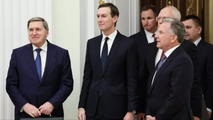 O conselheiro de política externa da presidência russa, Yuri Ushakov, à esquerda, o genro de Donald Trump, Jared Kushner, ao centro, o enviado especial dos EUA Steve Witkoff, em primeiro plano à direita na Rússia (Foto: AP)