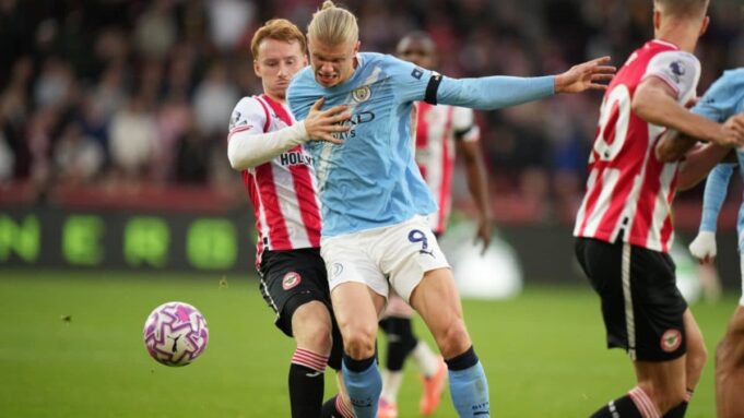 O Sepp Van den de Brentford, Erling Haaland, do Manchester City, durante a partida de futebol da Premier League inglesa entre Brentford e Manchester City, em Londres, domingo, 5 de outubro de 2025. (AP Photo/Alastair Grant)