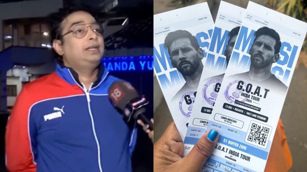 (Esquerda) O organizador do evento de Lionel Messi em Calcutá, Satadru Dutta, foi preso por suposta má gestão; (à direita) ingressos para o evento Lionel Messi ‘GOAT India Tour 2025’ no âmbito da ‘Iniciativa Satadru Dutta’. (Imagem: Notícias18)