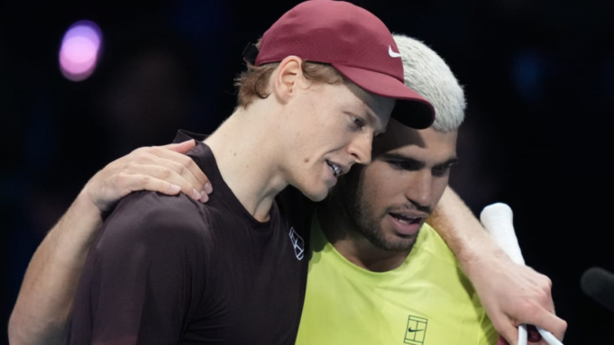 Jannik Sinner e Carlos Alcaraz nas finais do ATP (AP)