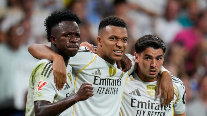 Kylian Mbappe, do Real Madrid, comemora com Vinicius Junior, à esquerda, e Brahim Diaz depois de marcar o terceiro gol de seu time durante a partida de futebol espanhola da Liga entre o Real Madrid e o Villarreal no Santiago Bernabeu Stadium/Madrid, Espanha, sábado, 4 de outubro, 2025.