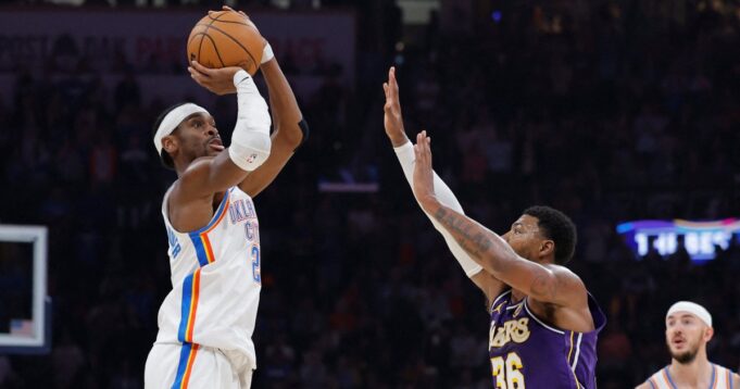 Shai Gilgeous-Alexander fez 30 pontos e nove assistências em três quartos na vitória do Oklahoma City Thunder sobre o Los Angeles Lakers por 121-92.