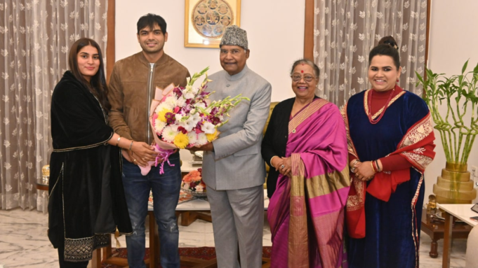“O tenente-coronel Neeraj Chopra, PVSM, VSM, medalhista de ouro olímpico, junto com sua esposa Smt. Himani fizeram uma visita de cortesia em minha residência hoje. Trocamos saudações sazonais”, disse Ram Nath Kovind no post X.