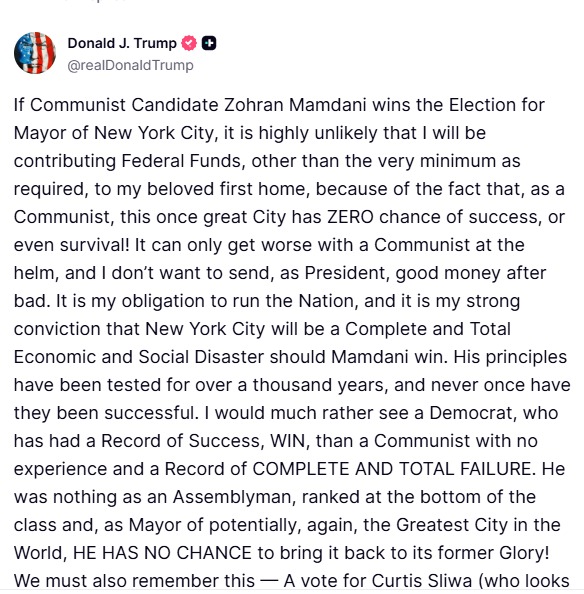 Numa longa publicação na sua plataforma Truth Social, Trump escreveu: “Se o candidato comunista Zohran Mamdani vencer a eleição para presidente da Câmara da cidade de Nova Iorque, é altamente improvável que eu contribua com fundos federais, para além do mínimo exigido, para a minha amada primeira casa”.