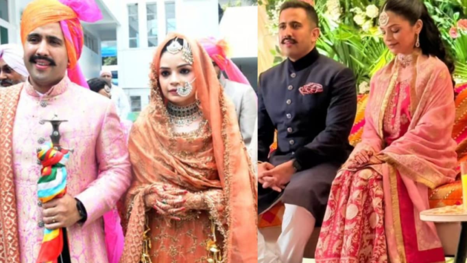 Vestindo um turbante laranja e rosa brilhante e um ‘sherwani’ rosa pastel, Vikramaditya, o segundo MLA da Shimla Rural, carregava uma espada cerimonial enquanto Amreen, que estava acompanhada no casamento por seus pais, foi vista usando um ‘lehenga’ bordado.