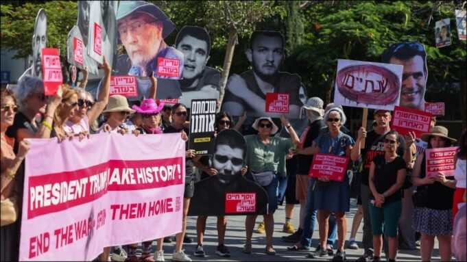 As pessoas levantam cartazes e retratos de israelenses mantidos reféns na faixa de Gaza desde 2023 no segundo aniversário do ataque de 7 de outubro liderado pelo Hamas. (AFP)