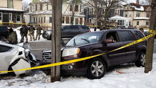 Imagens de vídeo tiradas do local mostram agentes do ICE se aproximando de um SUV marrom escuro parado no meio da estrada coberta de neve. Quando um agente tentou abrir a porta, o motorista deu ré no veículo e tentou fugir.