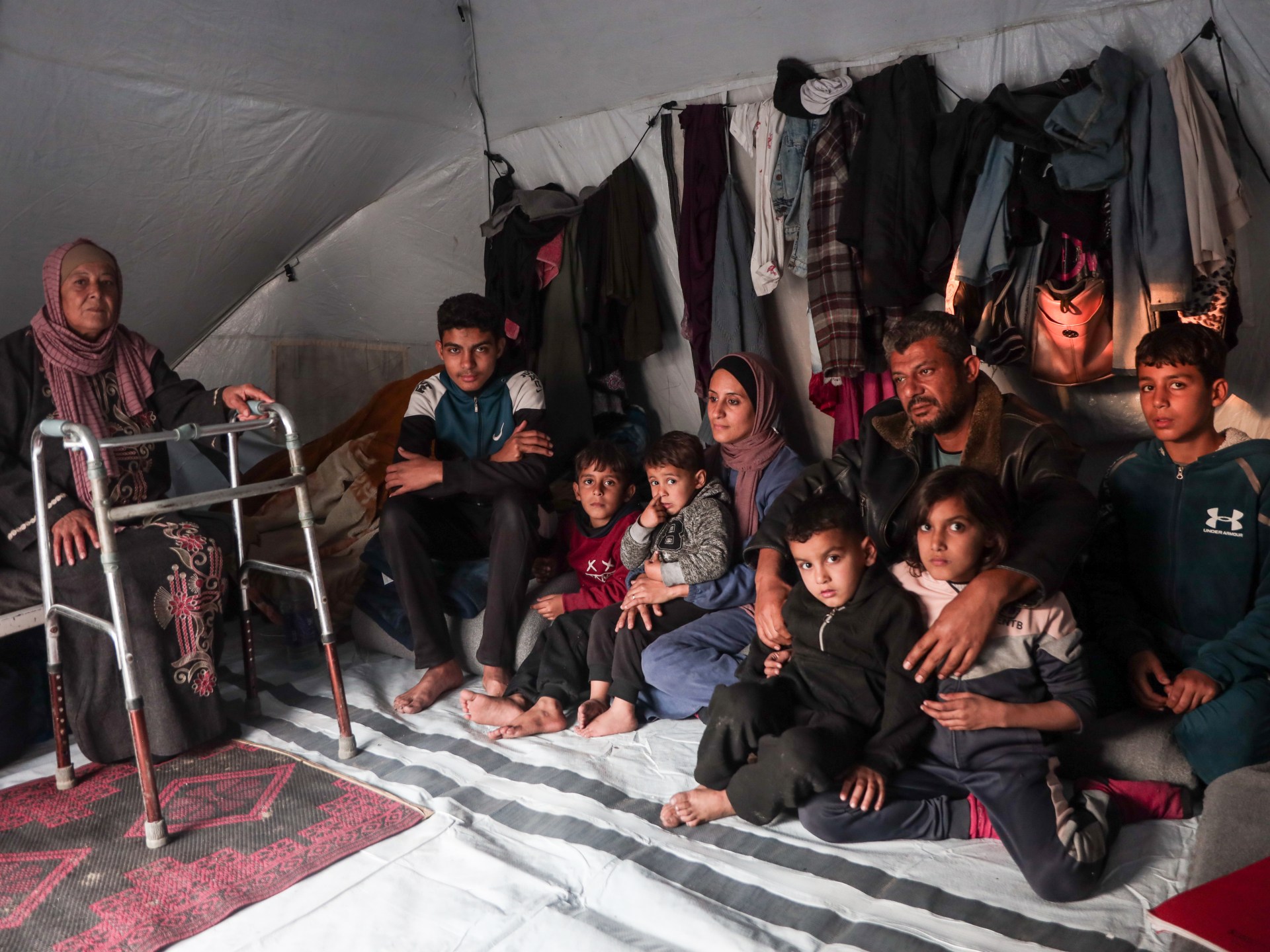 Cidade de Gaza- Apertado numa pequena tenda numa escola gerida pelas Nações Unidas no centro da cidade de Gaza, Alaa Alzanin, juntamente com a sua esposa, cinco filhos, a sua mãe de 71 anos e a irmã mais nova, estão a procurar abrigo depois de terem perdido a sua casa em Beit Hanoon durante a guerra de Israel. Eles foram deslocados oito vezes e é nesta tenda que agora se protegem da chuva e do frio do inverno.