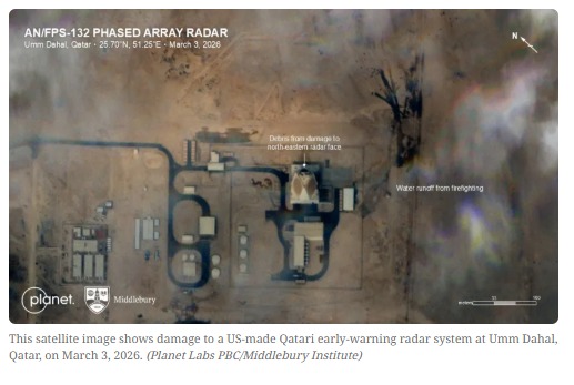 Imagens revisadas por pesquisadores do Centro James Martin para Estudos de Não Proliferação mostram sinais de danos em um radar fabricado nos EUA localizado em Umm Dahal.