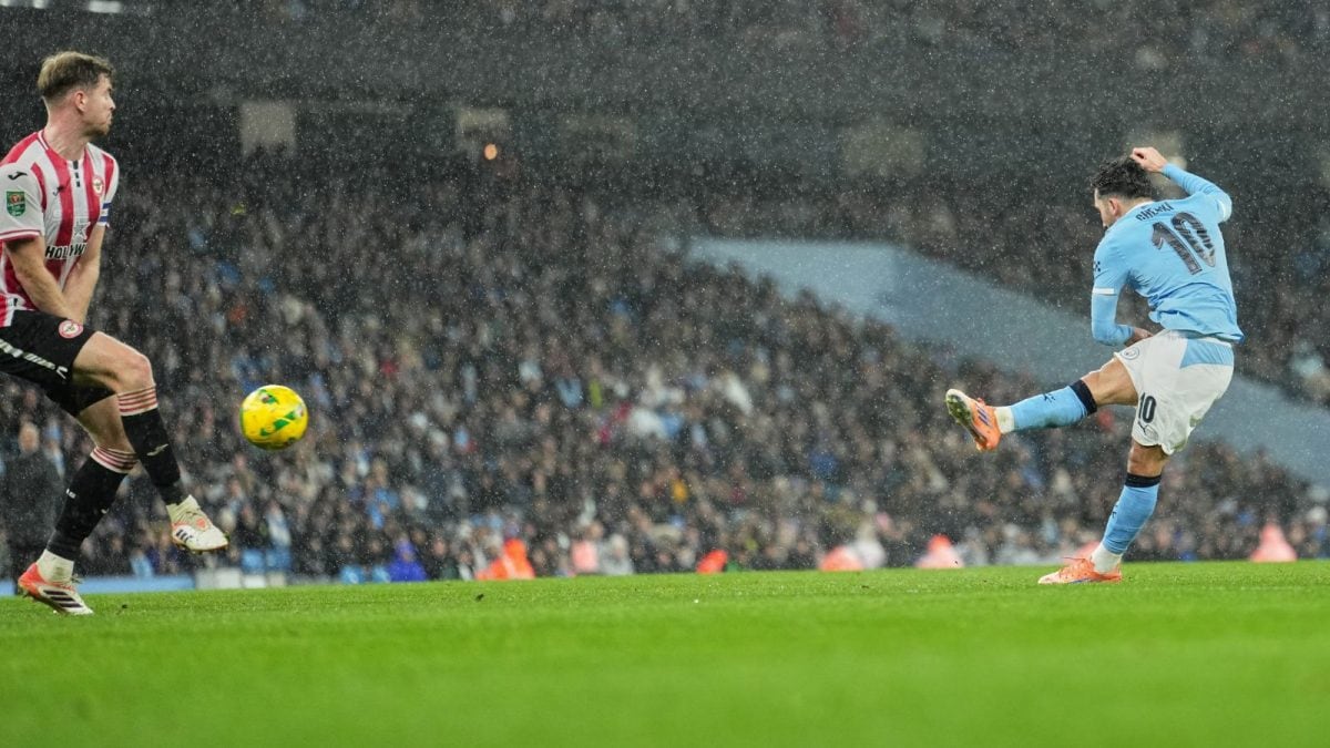 Rayan Cherki, do Manchester City, marca o primeiro gol de seu time durante a partida de futebol da Copa da Liga Inglesa entre Manchester City e Brentford em Manchester, Inglaterra, quarta-feira, 17 de dezembro de 2025. (AP Photo / Jon Super)