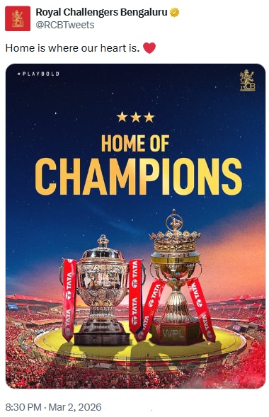 Royal Challengers Bengaluru foi ao X na segunda-feira (2 de março) para compartilhar uma postagem por meio da qual os campeões do IPL 2025 deram a entender que jogarão suas partidas em casa da edição de 2026 da Premier League indiana no Estádio M. Chinnaswamy. Em um tweet postado pelo RCB às 20h30 IST na segunda-feira, eles compartilharam uma foto dos troféus IPL e WPL com o Estádio M. Chinnaswamy ao fundo e a legenda: “Casa é onde nosso coração está”.