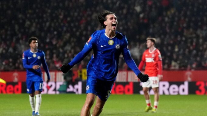 Marc Guiu, do Chelsea, comemora o terceiro gol de seu time no jogo durante a partida de futebol da terceira rodada da Copa da Inglaterra entre Charlton Athletic e Chelsea, em Londres, sábado, 10 de janeiro de 2026. (John Walton/PA via AP)