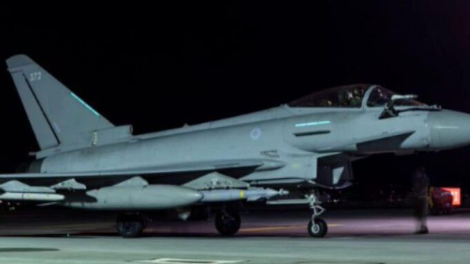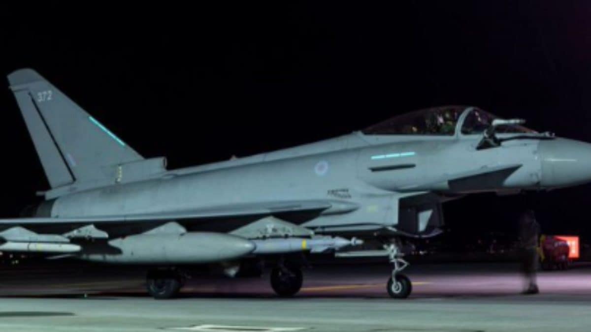 A Grã-Bretanha disse que usou jatos de combate Typhoon FGR4 para bombardear o alvo, apoiados por um navio-tanque de reabastecimento Voyager. (BBC/X)