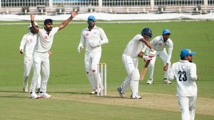 Em Vizianagaram: Foi um desgosto para Vishnu Solanki, que ficou preso em 99 e não foi eliminado quando Baroda chegou a 230/6 contra Andhra Pradesh em um dia chuvoso. A vigília de 183 bolas de Solanki, repleta de 12 quatros e dois seis, resgatou Baroda de 76/6 em parceria com o capitão *Atit Sheth (65)**. O estreante marinheiro K Saiteja impressionou por Andhra com 28/04.