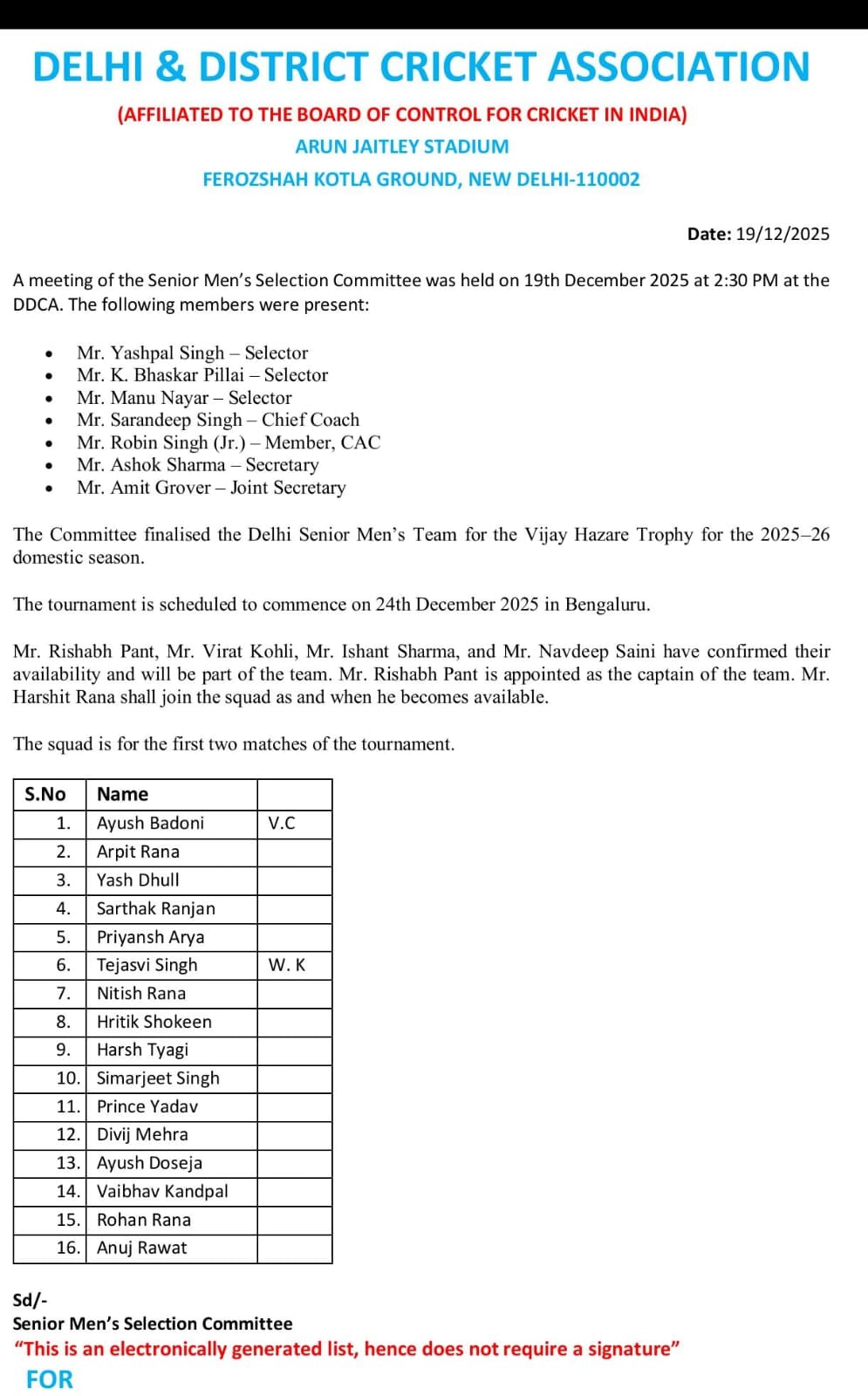 O batedor Wicketkeeper Rishabh Pant foi nomeado capitão de Delhi para o Troféu Vijay Hazare 2025-26 na sexta-feira. Além de Pant e Kohli, o time de Delhi também conta com nomes como Ishant Sharma, Harshit Rana, Navdeep Saini, Ayush Badoni, Yash Dhull, Priyansh Arya, Nitish Rana, Simarjeet Singh, Anuj Rawat e Sarthak Ranjan, entre outros.